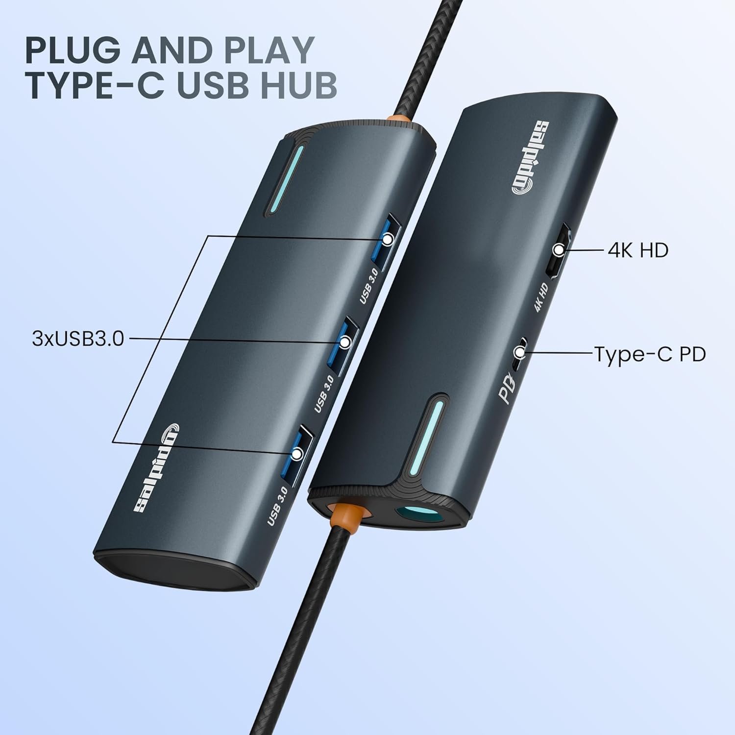 Sa fonction de charge rapide PD 100 W vous permet de recharger vos appareils rapidement tout en utilisant le hub. L’indicateur LED intégré vous informe en un coup d’œil sur son état, et son boîtier en alliage d’aluminium assure durabilité et élégance. Plug & Play, il ne nécessite aucune installation, rendant son utilisation intuitive et sans tracas.