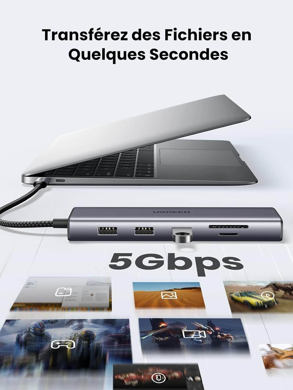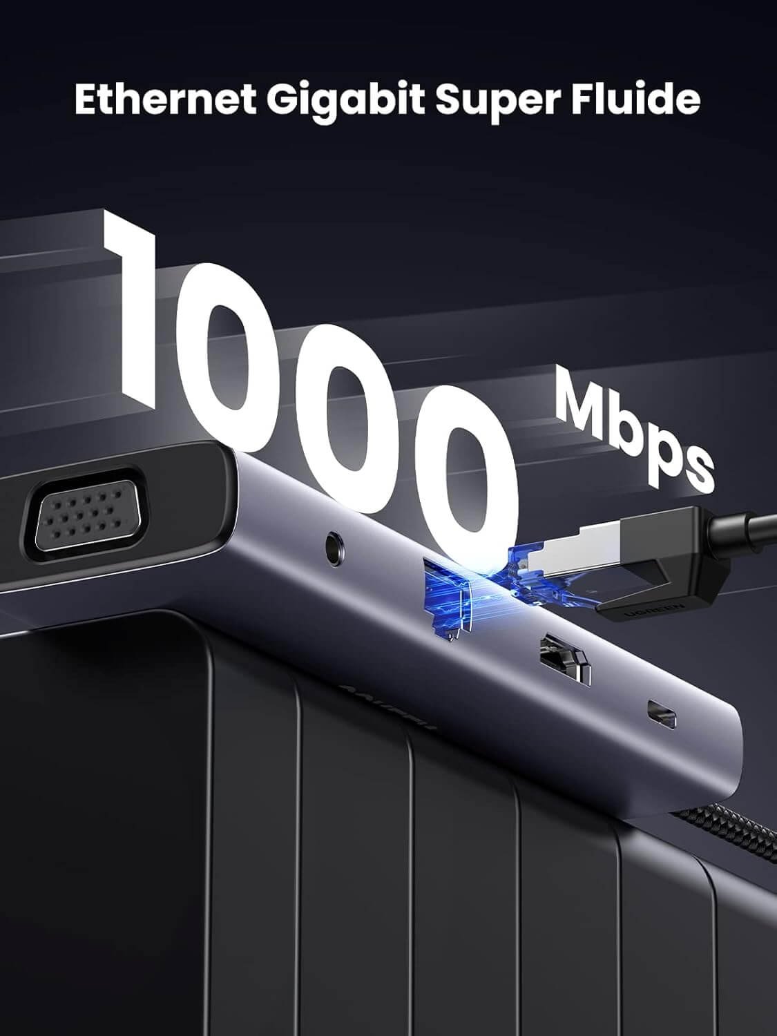 Optimisez votre espace de travail avec le hub USB-C 10-en-1 UGREEN, conçu pour une polyvalence inégalée. Que vous ayez besoin d’une sortie HDMI fluide pour des images 4K d’une netteté exceptionnelle ou d’une compatibilité VGA simplifiée pour les écrans plus anciens, ce hub répond à tous vos besoins de connectivité.
