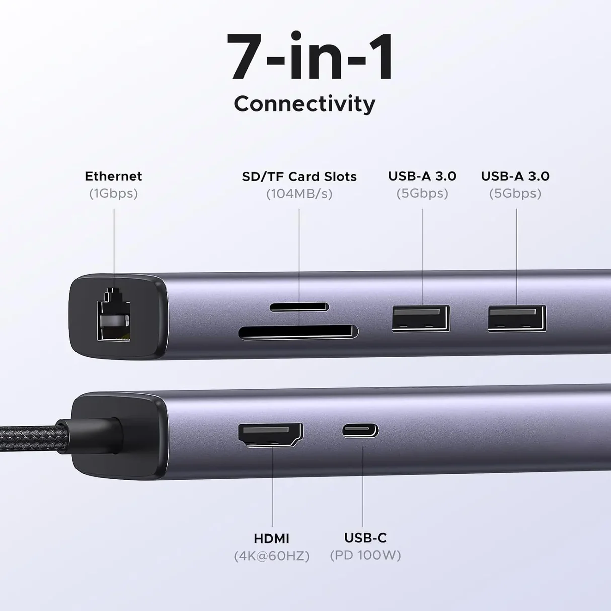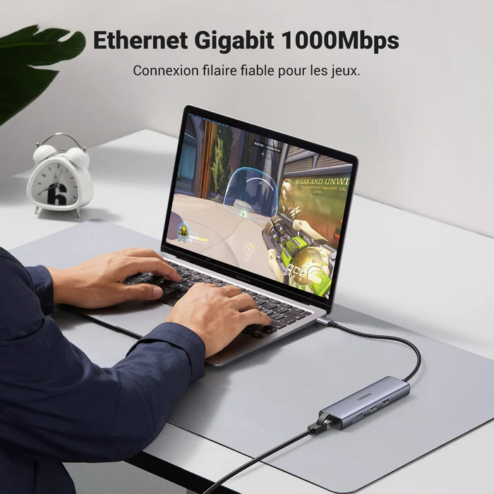 Avec ses 7 ports intégrés, dont USB-C, lecteurs de cartes SD et Ethernet Gigabit, la station d’accueil UGREEN répond efficacement à tous vos besoins de connectivité. Transferts de fichiers, duplication d’écran ou recharge d’appareils : cette solution 7-en-1 garantit des performances rapides et fiables en toutes circonstances.